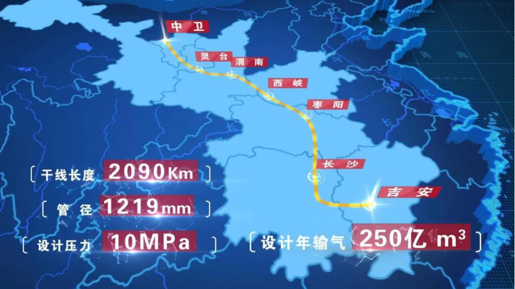 线中段工程开。月23日,西气东输三线中段(中卫—吉安)工程在宁夏中卫正式开工建设,工程全长2090公里,起自宁夏中卫,途经宁夏、甘肃、陕西、河南、湖北、湖南、江西7省(区),终点为江西吉安。西气东输三线中段工程途经黄土高原、秦岭、江南丘陵等复杂山区及灾害性地质地貌段,设计实施山岭隧道75处,穿越大中型河流35处,施工环境复杂,难度系数较大。